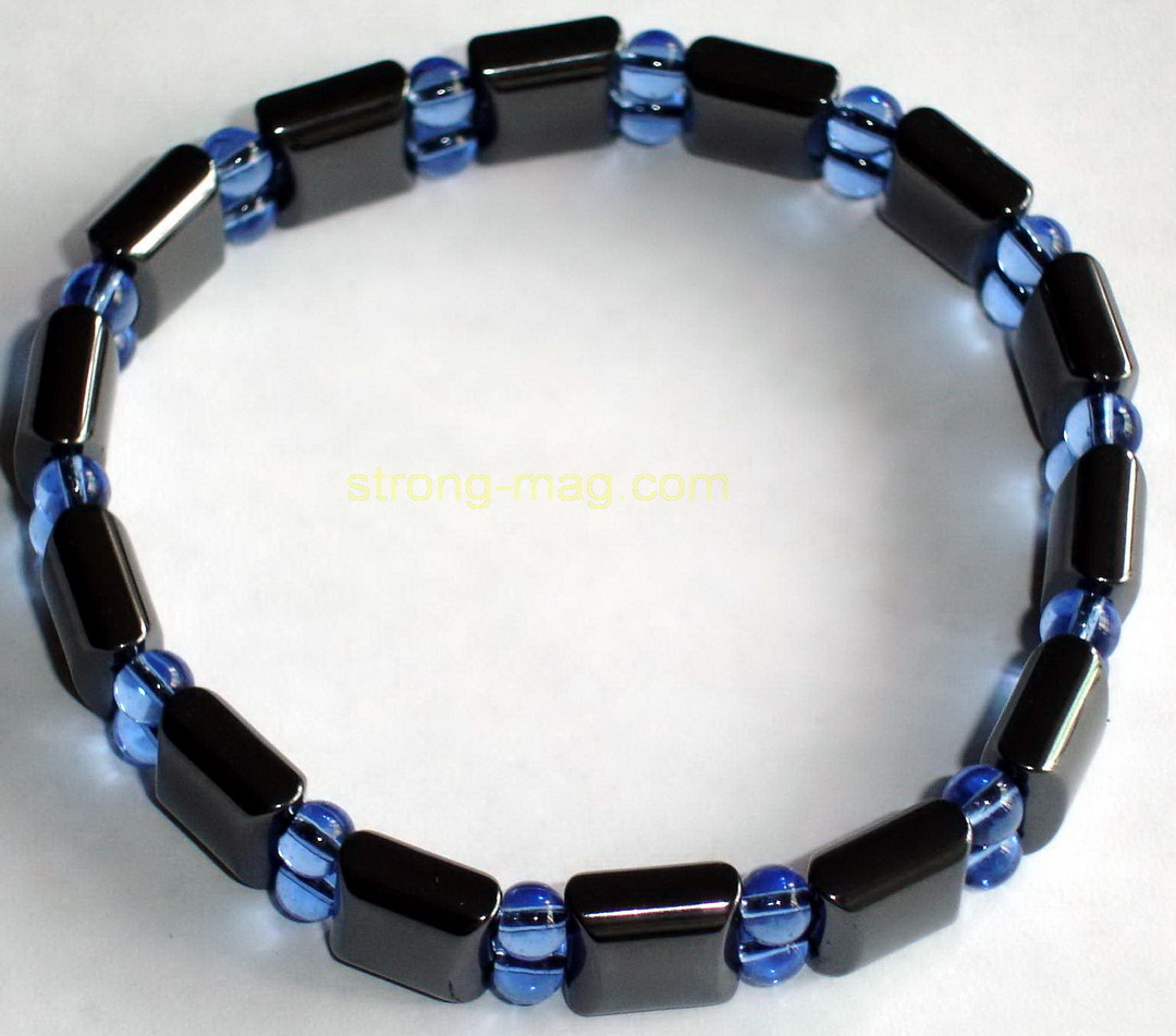 pcmagnetic elastic bracelet double lines, elastic length, black square 10mm magnetic spacer insert round 5mm blue glass beads 7 inch Ferrite Hematite Magnet A
