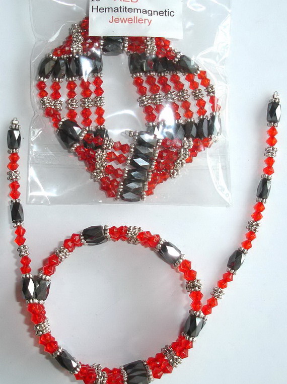 pcMagnetic wrap chain 36 inch length with red colour, it consists of black super magnetic diamond shape beads 6x8mm with1000 Gauss, insert red colour glass beads double cone 36 inch Ferrite Hematite Magnet A