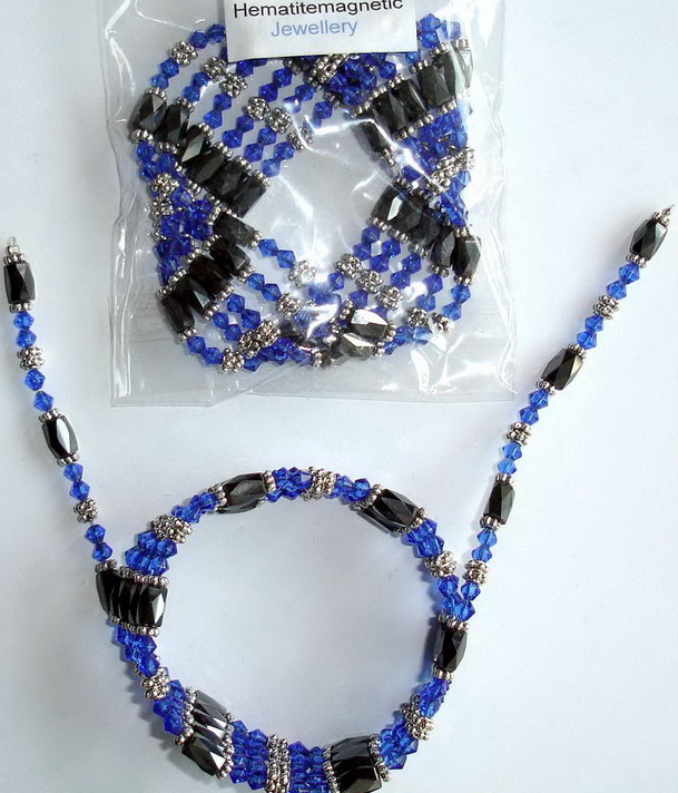 pcMagnetic wrap chain 36 inch length with blue colour, it consists of black super magnetic diamond shape beads 6x8mm with1000 Gauss and blue colour glass beads double cone 36 inch Ferrite Hematite Magnet A