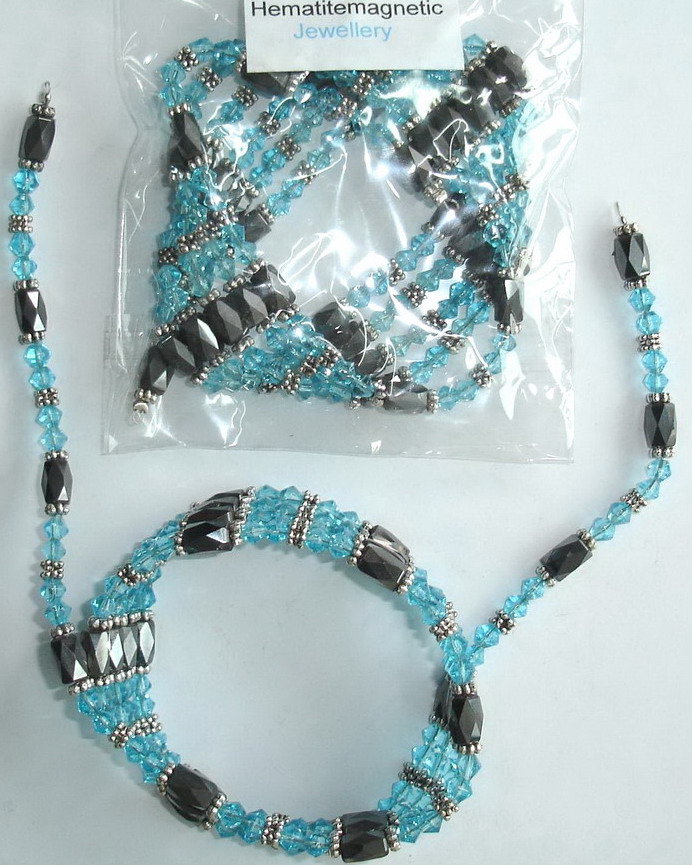 pcMagnetic wrap chain 36 inch length with sea blue colour, it consists of black super magnetic diamond shape beads 6x8mm with1000 Gauss and sea blue or little blue colour glass beads double cone 36 inch Ferrite Hematite Magnet A