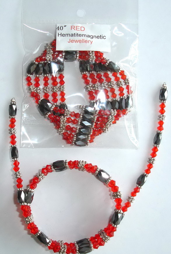pcMagnetic wrap chain 40 inch length with red colour, it consists of black super magnetic diamond shape beads 6x8mm with1000 Gauss, insert red colour glass beads double cone 40 inch Ferrite Hematite Magnet A