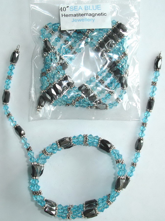 pcMagnetic wrap chain 40 inch length with sea blue colour, it consists of black super magnetic diamond shape beads 6x8mm with1000 Gauss and sea blue or little blue colour glass beads double cone 40 inch Ferrite Hematite Magnet A