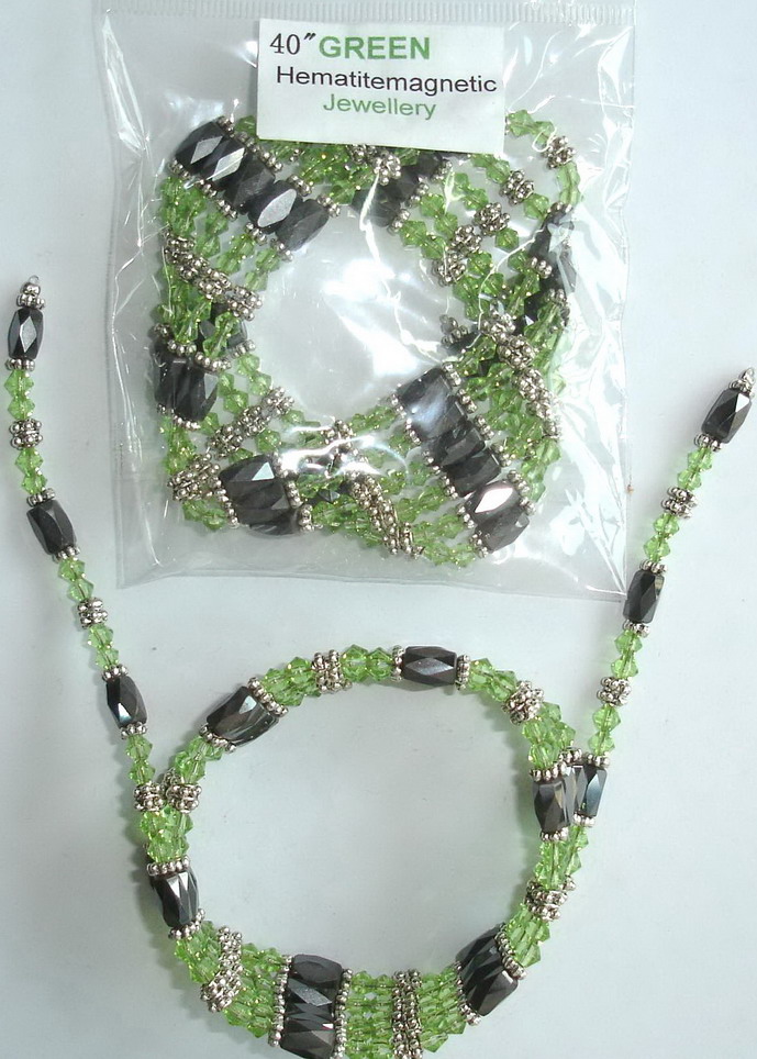 pcMagnetic wrap chain 40 inch length green colours, it consists of black super magnetic diamond shape beads 6x8mm with1000 Gauss and green colour glass beads double cone 40 inch Ferrite Hematite Magnet A