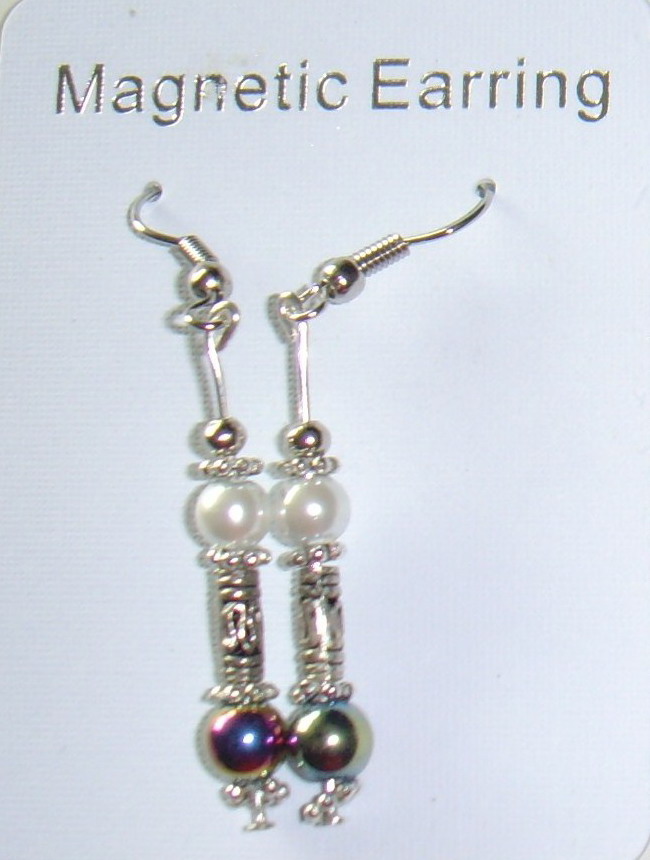 pairdangled earring with multi-colours or rainbow magnetic round beads and metal beads assembly 6 mm Ferrite Hematite Magnet A