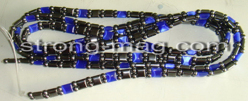 strip2 lines belt with inserted dark blue cat eye, consist by 10mm square magnetic spacer and dark blue cat eye spacer and 5mm round beads,2 meter length with extra 1 meter copolymer line, the product is prepared to make double bracelets. 2M Ferrite Hematite Magnet A