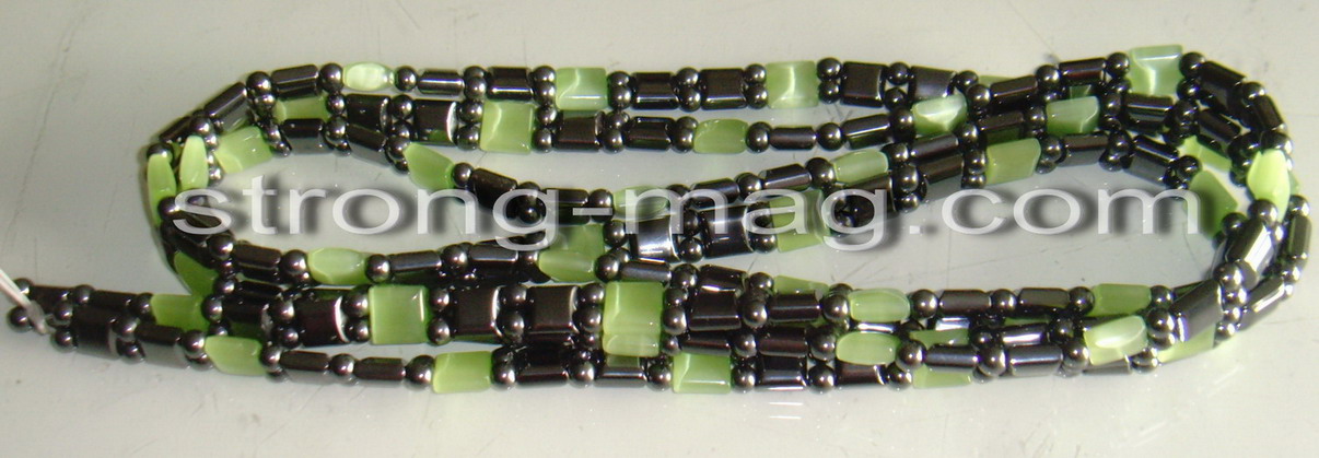 strip2 lines belt with inserted green cat eye spacer, consist by 10mm square magnetic spacer and green cat eye spacer and 5mm round beads,2 meter length with extra 1 meter copolymer line, the product is prepared to make double bracelets. 2M Ferrite Hematite Magnet A