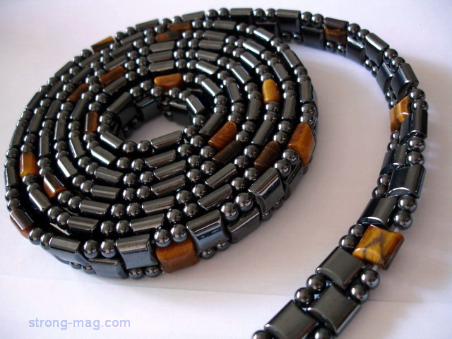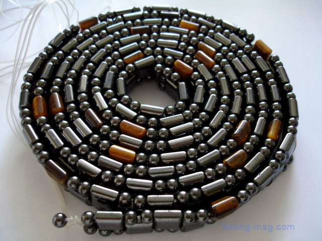 strip3 lines belt with inserted brown tiger eye, consist by 10mm square magnetic spacer and brown tiger eye spacer and 5mm round beads,2 meter length with extra 1 meter copolymer line, the product is prepared to make triple bracelets. 2M Ferrite Hematite Magnet A