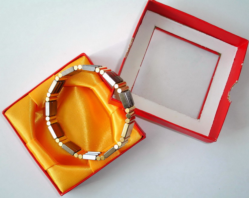 pcStrong magnetic bracelet 9 inch length, stringless bracelet by all rare earth magnets assembly, the length or style can be changed easily by taking off magnets or reassembly, it consists of numerous rod or bar magnets with golden or grey Ni pating 9 inch NdFeB Magnet A