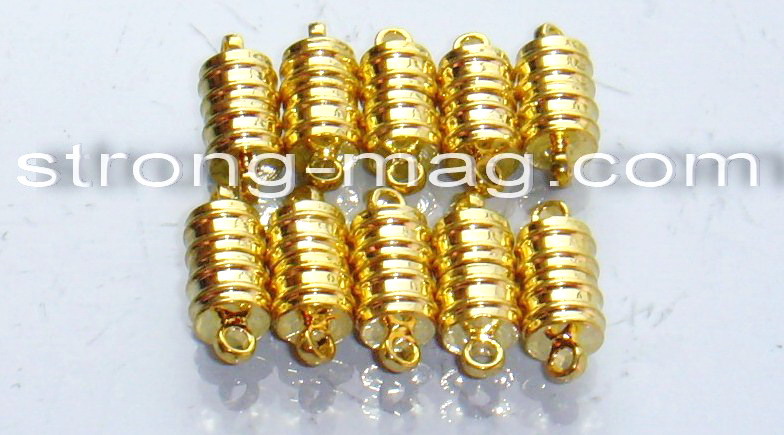 pairmagnetic clasp with groove barrel shape, golden plating, it is mounted by copper shell and strong rare earth magnets inside, diameter 8mm by high 10mm. a pair of clasp consists of 1 male and 1 female. 8X20mm NdFeB Magnet N35