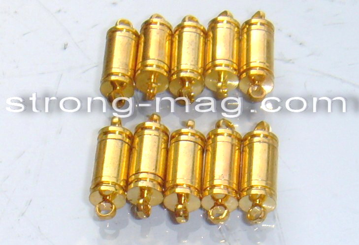 pairmagnetic clasp, insert round tube shape, golden plating, it is mounted by copper shell and strong rare earth magnets inside, diameter 5mm by high 17mm clasp. 5X17mm NdFeB Magnet N35