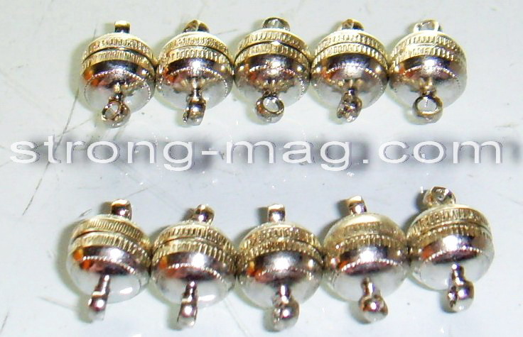 pairmagnetic clasp with lid shape, Nickel plating, it is mounted by copper shell and strong rare earth magnets inside, diameter 8mm by high 14mm. a pair of clasp consists of 1 male and 1 female. 8X14 mm NdFeB Magnet N35