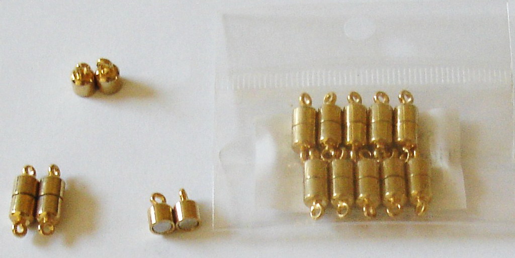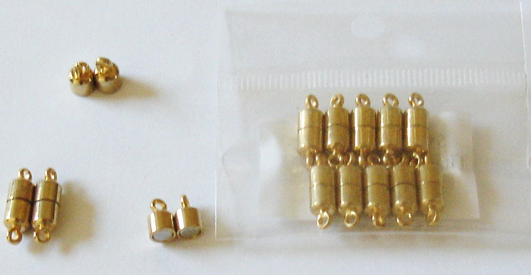 pairunique magnetic clasp with golden plating, it is mounted by titanium steel shell and strong rare earth magnets, with seamless ring hook,diameter 4.6mm by high 8.6mm. a pair of clasp consists of 1 male with E letter mark and 1 female with G letter 4X9mm NdFeB Magnet Titanium A
